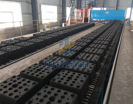 1、全自動造型機打出來砂型直接在鏈板線上循環(huán)輸送,可以是單排雙列,也可以雙排雙列;
